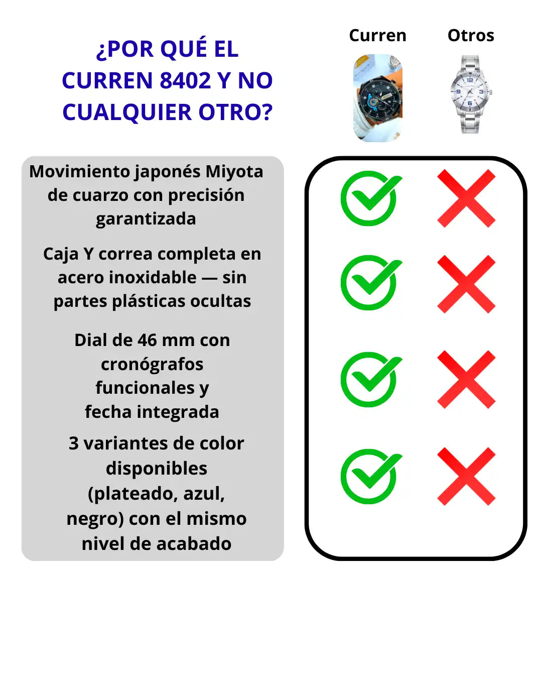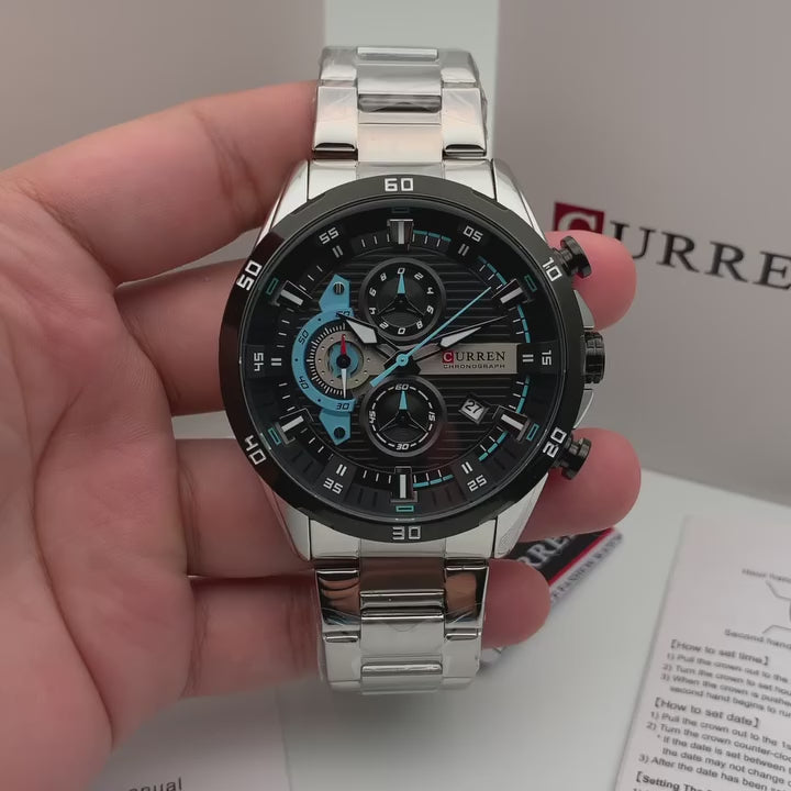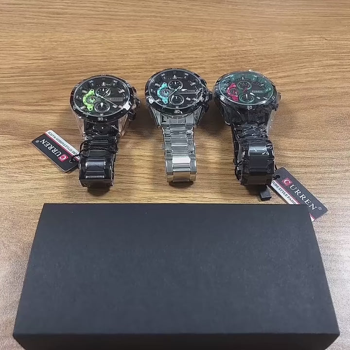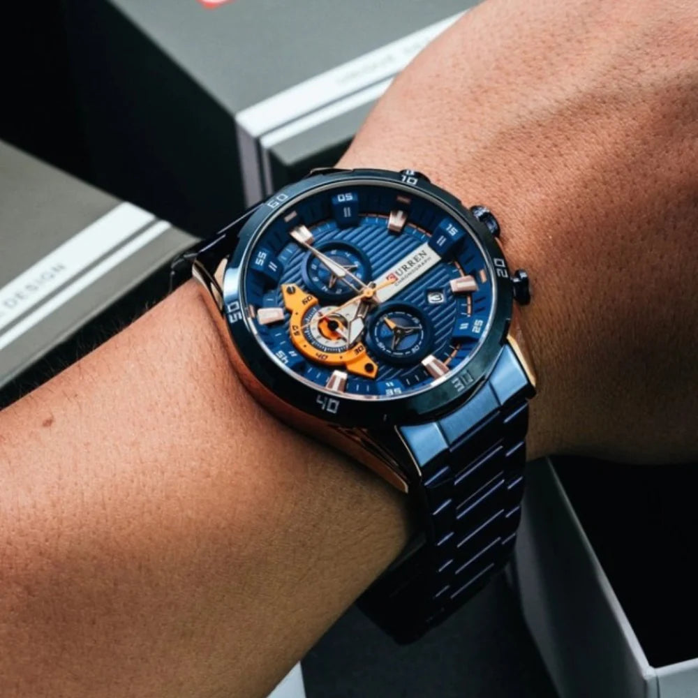 Un reloj no es solo un instrumento para ver la hora. Es lo primero que nota alguien cuando estrechas la mano, cuando firmas, cuando señalas. El Curren 8402 está construido para que ese momento trabaje a tu favor: caja de acero inoxidable, dial de 46 mm con cronógrafos funcionales y movimiento japonés Miyota de cuarzo que mantiene la precisión sin que tengas que pensar en ello.
